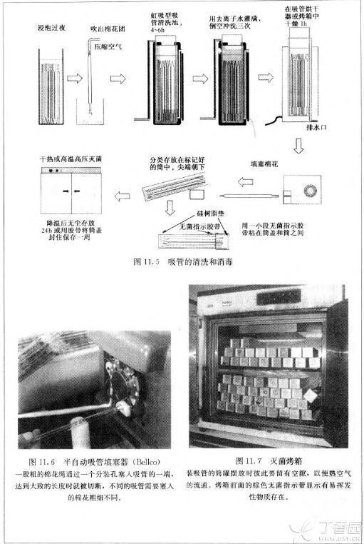 5. 干熱滅菌,160°C 1 h。要盡可能少用膠帶,或換用溫度指示標簽(Alpha Medical;Bennnet),此標簽很小并不含爆炸性物質。要在烤箱的中心檢測溫度,以保證這個**難到達的部位也能滿足**低的滅菌條件。要保證烤箱 中的罐子之間有一定的空隙,這樣可以使熱空氣流通(圖 11.7)。