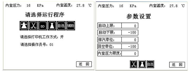 菌過程的溫度、壓力、時(shí)間、過程階段、預(yù)置參數(shù)等均在觸摸屏顯示器中自動顯示并可以隨時(shí)儲存,并配有微型打印機(jī)進(jìn)行打印工作過程參數(shù)以便于歸檔、備查。此外,該控制系統(tǒng)配備有一套完整的自測及校正程序,可以實(shí)現(xiàn)不同海拔高度下、不同地區(qū)的壓力、溫度等參數(shù)的校正;還具有多級控制保護(hù)、幫助功能。
